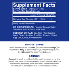 Each 1 mL serving provides 10 mg of Methylene Blue Trihydrate (USP) — measured for accuracy and supported by strict quality control.